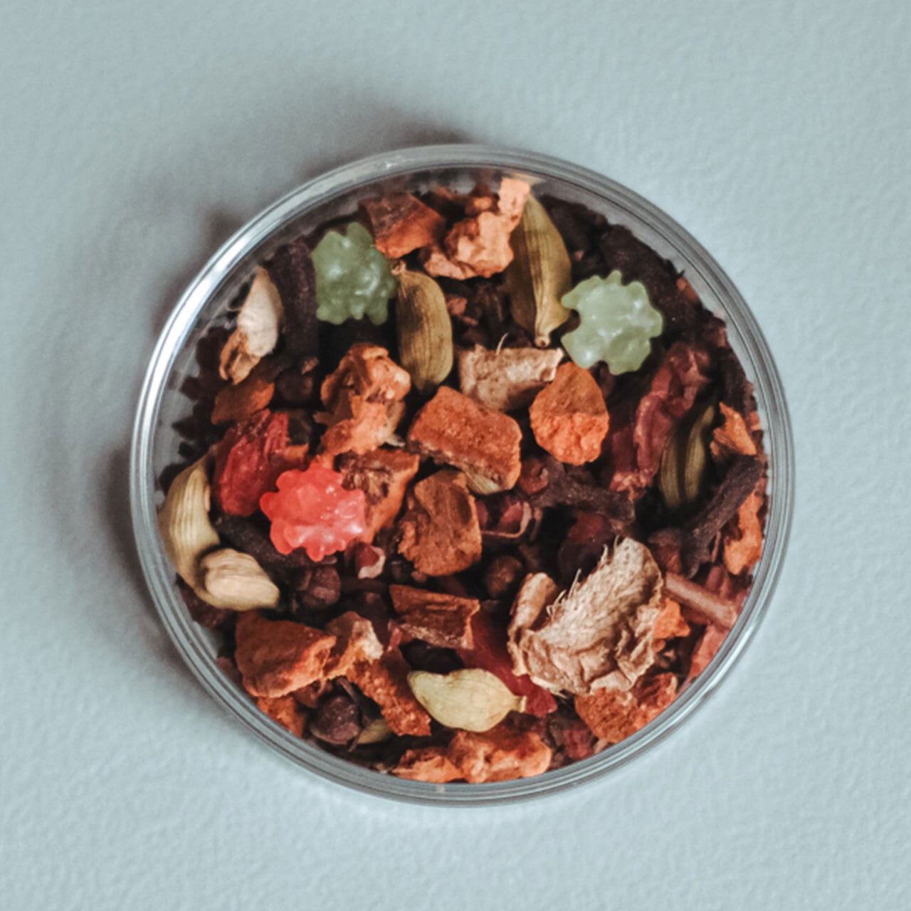 温活の味方をしてくれるあたためスパイスと和の素材を組み合わせた、冬限定のカフェインレス・クリスマスティーです。番茶の焙煎香が、スパイスの刺激をやさしく包み込み、飲み飽きないバランスとなっています。カルダモンの緑、クコの赤、ジンジャーの黄色、そして金平糖などの華やかなブレンドです。
