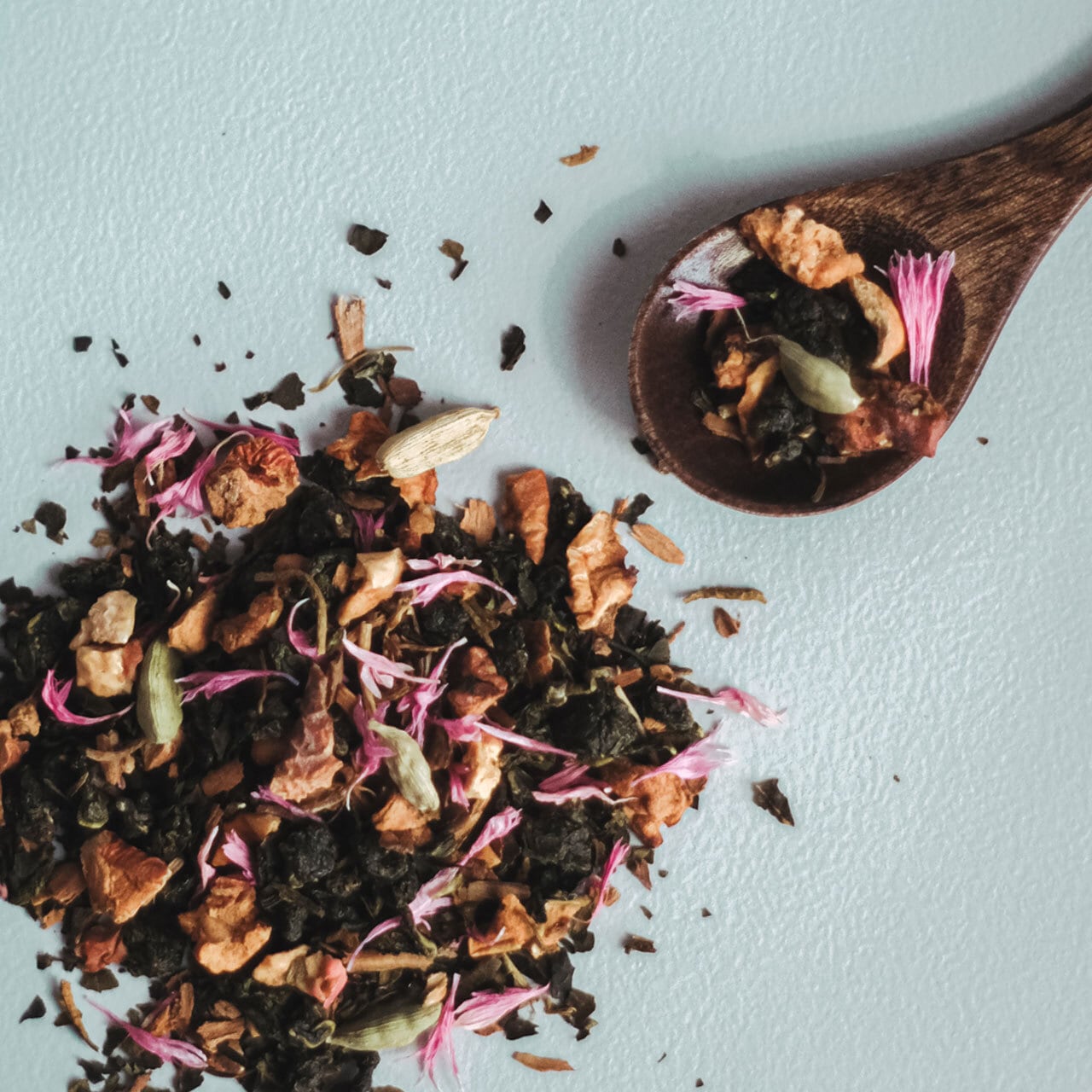 ベースとなる「四季春茶」は凍頂烏龍茶の一種で、渋みが少なく甘い余韻が続く飲みやすいお茶。その親しみやすさの上に、桜葉やスパイスの個性的な香りが重なることで、他にはない春らしい一杯が生まれました。ハーブティーが苦手な方にも手に取っていただきやすいブレンドです。